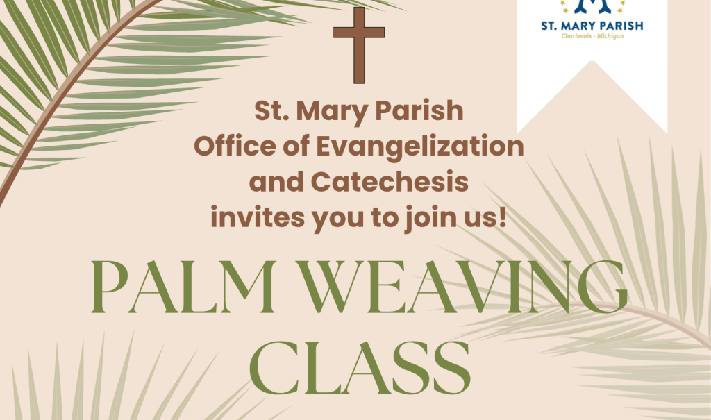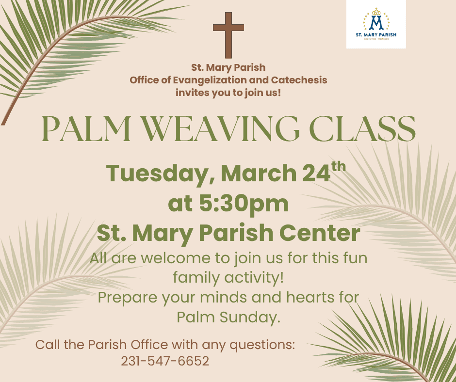 This Tuesday, March 24th at 5:30pm, we will be having a Palm Weaving Class. Join us for this unique Lenten family night! All are welcome to attend. Learn traditional palm weaving and enjoy time preparing for Holy Week.